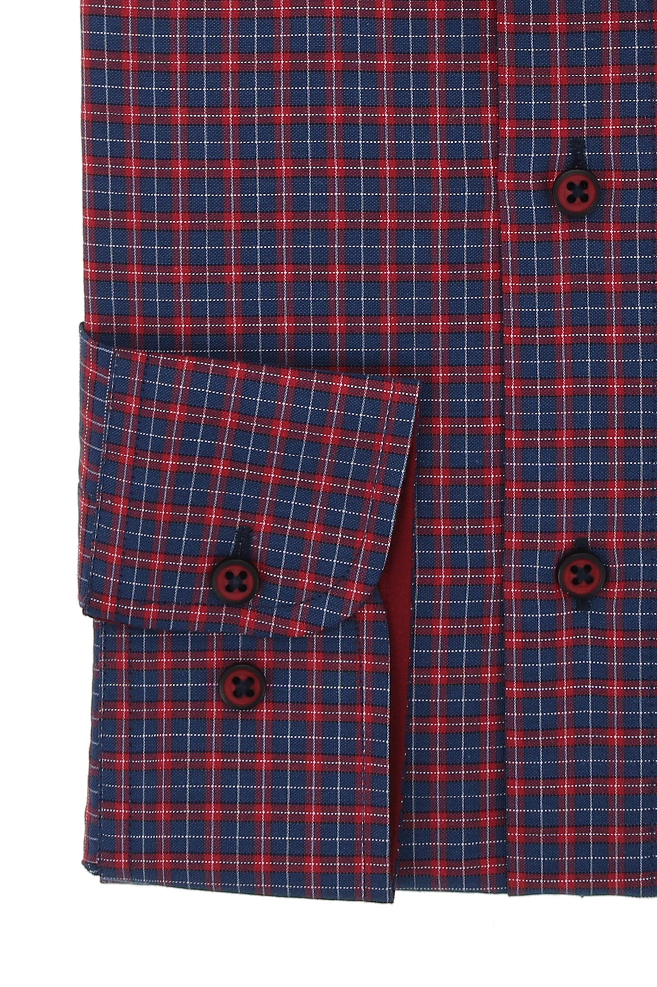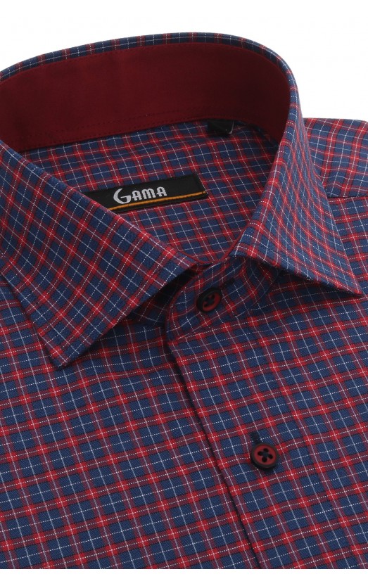 Camasa bleumarin cu carouri rosii, confectionata din bumbac si poliester, fiind usor de calcat si intretinut. Are guler clasic, evazat, maneca lunga si manseta simpla. Este o alegere moderna, indiferent de imprejurari.